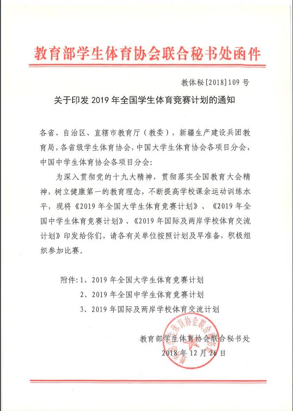 近日,教育部学生体育协会联合秘书处公布了《2019年全国大学生体育竞赛计划》、《2019年全国中学生体育竞赛计划》、《2019 年国际及两岸学校体育交流计划》,其中,“2019年...