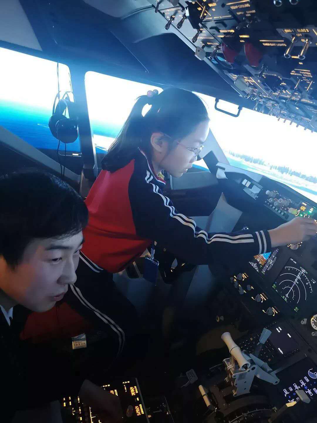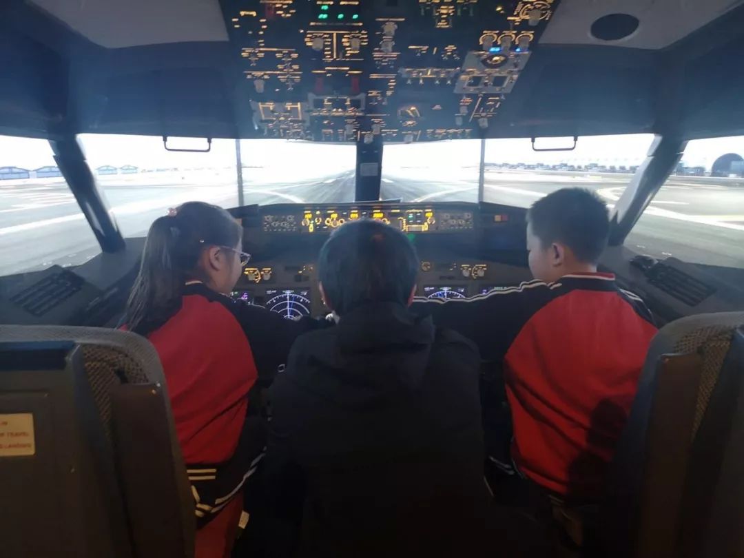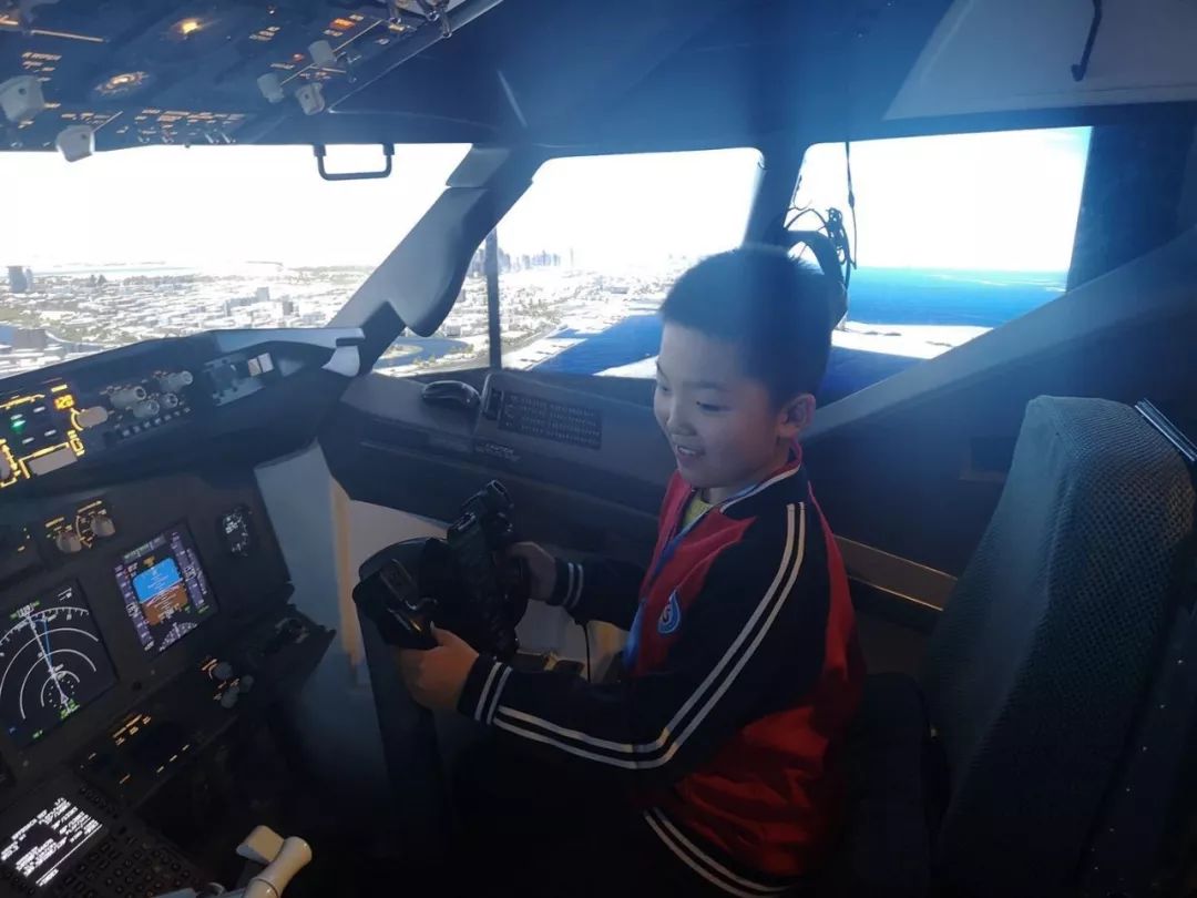 在孩子们进行科普课堂学习的同时,基地将孩子分为四人一组进入波音737-800模拟驾驶舱体验驾驶,让孩子的视野达到前所未有的高度,实际操作起飞和降落,体验刺激的超重、失重感,拓宽孩子视野,也给孩子童年留下精彩回忆。