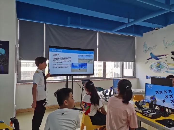 由我们馆内的小学员为大家讲解了模拟飞行的赛事 项目 以及设备的操作流程...学生们也认真倾听并积极举手回答问题。