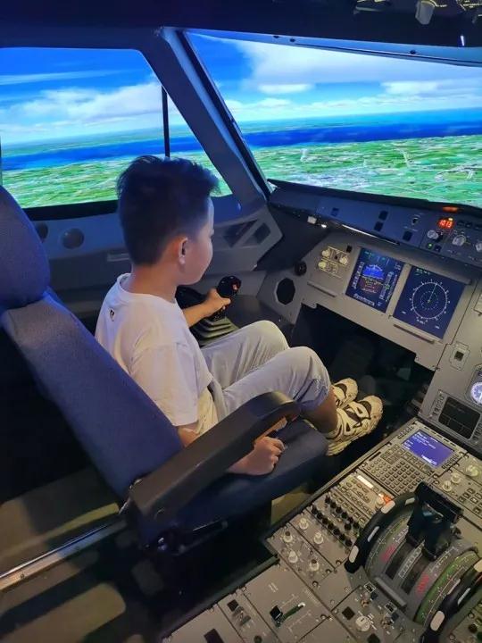 老师和孩子们进行模拟仓体验,1:1模拟舱多方位视角让老师和孩子们体验开飞机的刺激。